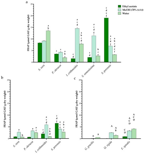 The results of the FRAP assay are shown in Figure 5a–c. In HAs, the highest FRAP values were found in the leaves (see Table S1), mostly in methanolic extracts, except in S. vera and S. perennis, where the aqueous and ethyl acetate extracts, respectively, showed higher FRAP values (Figure 5a,b). In seaweed, the yield was higher in aqueous and methanolic extracts, with U. rigida and F. spiralis showing the highest values (Figure 5c).