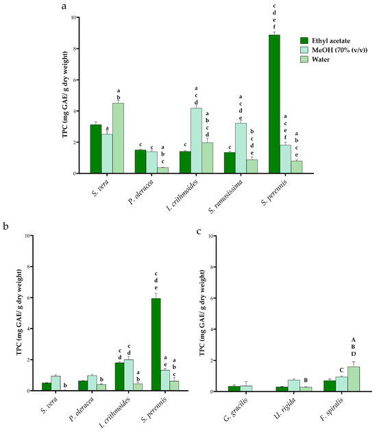 Total phenolic content determined in leaves (a) stems of HAs (b) and in seaweed (c). For HAs, statistical differences were compared with a—ethyl acetate extraction and b—methanol extraction between the same species (c—S. vera, d—H. portulacoides, e—I. crithmoides and f—S. ramosissima) between the same extraction solvent. For seaweed, statistical differences were compared with A—ethyl acetate extraction and B—methanol extraction in the same species (C—G. gracilis and D—U. rigida) between the same extraction solvent.