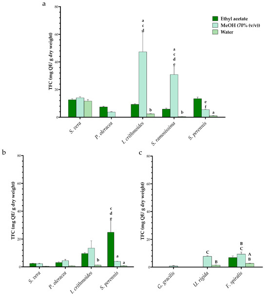 Total flavonoid content determined in leaves (a) and stems of HAs (b) and in seaweed (c). For HAs, statistical differences were compared with a—ethyl acetate extraction and b—methanol extraction between the same species (c—S. vera, d—H. portulacoides, e—I. crithmoides and f—S. ramosissima) between the same extraction solvent. For seaweed, statistical differences were compared with A—ethyl acetate extraction and B—methanol extraction between the same species, C—G. gracilis between the same extraction solvent.