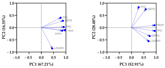 Furthermore, the results of HA reveal a strong positive correlation between PC1 and FRAP (0.960) and TPC (0.909). Additionally, PC1 exhibits a moderate positive correlation with TFC (0.782), as well as strong positive correlations with ABTS (0.875) and DPPH (0.845). Seaweed also showed a strong positive correlation between PC1 and TPC (0.939) and FRAP (0.930). Regarding PC2, for HAs, a strong negative correlation was observed between PC2 and Lowry (−0.852), while for seaweed, a strong positive correlation was detected between PC2 and TFC (0.833) and a moderate correlation between PC2 and ABTS (0.750). Indeed, the analysis of the results of HAs indicates that PC1 explains 67.21% of the variance and PC2 explains 16.55%, which means that the two components allowed for an 83.76% distinction between the different assays. On the other hand, the results for seaweed show that PC1 explains 52.91% of the variance in the dataset, whereas PC2 explains 28.48%, which means that the two components were recognized for 81.39% of the separation between different assays.