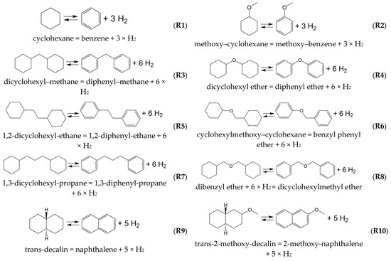 It is known that the hydrogenation of aromatics is a thermodynamically favourable reaction. However, reversible dehydrogenation is thermodynamically unfavourable, and only the optimisation of the reaction conditions helps to shift the equilibrium towards a sufficient release of hydrogen. Understanding the general regularities between the structures of LOHC counterparts and their thermodynamic properties is essential for screening molecules suitable for practical applications. Typical dehydrogenation reactions of hydrocarbon-based LOHCs and their analogues with oxygen functionality are shown in Figure 1.