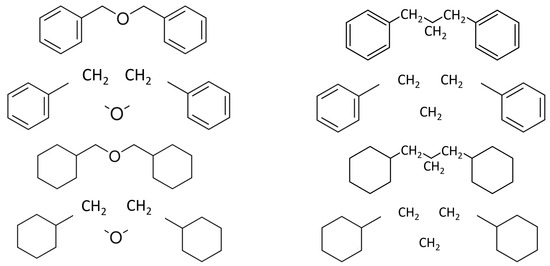Group additivity (GA) methods are another valuable way of correlating structural properties. These methods are generally based on the idea of the Lego box, where a property of a molecule is assembled from small building blocks with well-established numerical contributions. Comprehensive systems of group contributions (or increments) have been developed for most major classes of organic compounds [14]. The set of group contributions used in this work for the prediction of thermodynamic properties is listed in Table S8. However, it is well known that the conventional GA methods have difficulties with cyclic molecules. To improve the quality of the prediction, numerous and unique ‘ring’ corrections are proposed [14,35]. However, for the molecules investigated in this work, it might be more practical to use a phenyl fragment (C6H5−) and a cyclohexyl fragment (C6H11-) developed as shown in Figure S1 instead of the ‘ring’ corrections. These fragments were used to calculate the thermodynamic properties of aromatic and aliphatic ethers and hydrocarbons and their hydrogenated counterparts. The examples of GA calculations for the LOHC pairs dibenzyl ether/dicyclohexylmethyl ether and 1,3-diphenylpropane/1,3-dicyclohexylpropane are shown in Figure 2.