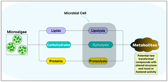 The process of biotransformation in microalgae, carried out by LAB and S. cerevisiae, entails the enzymatic alteration of some bioactive primary compounds including; lipids [87], proteins [88,89], pigments [88], and polysaccharides [90] to yield useful products. Besides LAB and S. cerevisiae can break down sugars found in microalgae biomass, resulting in the creation of organic acids, alcohols, and other substances, they can facilitate the decomposition of intricate structures such as proteins and lipids, resulting in the liberation of amino acids, fatty acids, and other biologically active substances [91].