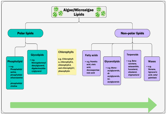 Lipid classification of algae/microalgae including some representative metabolites. Green arrow represents polarity. According to the green arrow, lipid classes are arranged from left to right, from polar to non-polar, based on their interaction with water molecules [116].