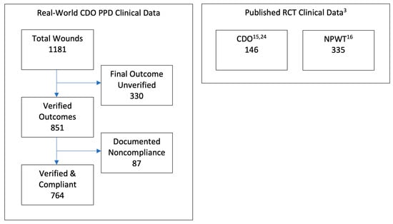 The PPD records contain baseline data and routine follow-up records from clinicians’ notes for patients treated with CDO at a variety of clinics. The PPD was designed to capture basic baseline wound data such as wound size, type, and age, as well as patient age and sex. Other baseline data that can affect wound healing, such as infection status, vascular status, comorbidities, HbA1c, off-loading, nutritional status, etc., were not routinely tracked or reported by the clinics and are, therefore, not considered here. The overwhelming majority of the records are from wound care clinics. The data entries from those records in the PPD were verified by a third-party clinician. Patients whose records could not be verified were excluded from this analysis of the PPD. There are 330 records that do not list a final verified outcome, i.e., healed versus not healed, which are excluded from this analysis. Most of the excluded records were from patients who were lost to follow-up or for whom a final treatment record could not be obtained. While this number appears high compared to controlled studies, it is more reflective of real-world scenarios where patients do not return for a variety of reasons [14]. This leaves 851 valid patient records upon which this analysis is based. These statistics are based on whatever data are available for each measure: some records had data points that were missing or could not be verified for a particular outcome. In particular, patients for whom no information on the outcome of the therapy (treatment outcome = clinical data insufficient) are excluded from the efficacy calculations entirely. Thus, success = healed/(healed + goals not met). The patients in the PPD were seen and treated over an eight-year period, September 2009 through May 2017, and as such, the patients entered the analysis database continuously throughout this time period. Of these 851 patients, 87 had documented non-compliance in the clinical records. These patients were also excluded, resulting in a total of 764 patients who met all inclusion and exclusion criteria. Figure 1 gives a summary illustration of the various datasets used in this analysis, including clinical trial data for comparison to the PPD.