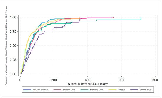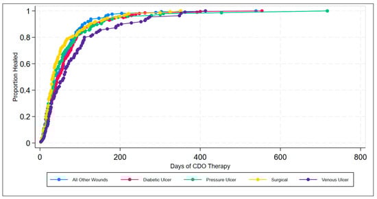 The results from the real-world PPD demonstrate the effective clinical performance of CDO therapy across a broad range of wound types, including ulcers, burns, and surgical wounds, as well as a broad range of locations on the body from toe to head. These results are consistent with the results reported from published studies on various wound types [3,4,15,22,23,24,25]. Looking at the life table and the inverse Kaplan–Meier estimates of successful wound closure for the various wound types, it can be seen that CDO therapy is highly effective across all wound types, averaging 65 days for the healing wounds across all wound types on wounds that have been open an average of 298 days prior to starting CDO therapy. Comparing the data in Table 2 and Figure 3 and Figure 5, one can see that there is a difference in time to heal, with surgical wounds having the shortest time to closure and VLUs having the longest, with the other three wound classifications being fairly similar in their healing trajectory. This is reasonable since larger, more challenging wounds take longer to heal. This data indicates that CDO therapy is equally efficacious across a wide variety of wound types, including DFUs, VLUs, pressure ulcers, surgical wounds, burns, and more.