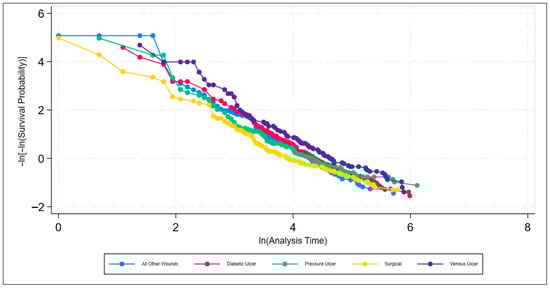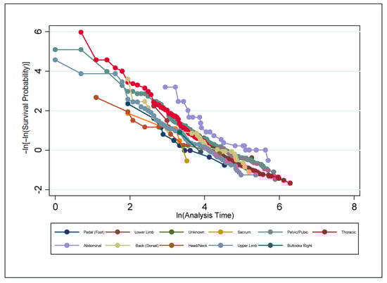 A series of non-parametric analyses was used to check for statistically significant differences among the individual factors within the discrete classifiers of wound location, wound type, and sex. To test the PH assumption, the Stata command stphplot was used. Under the PH assumption, the plotted log–log curves generated should be parallel. Age can be thought of as discrete or continuous; however, either way, Stata creates a plot for each value of age rather than just the coefficient on age when age is continuous. The plot is far too busy to be meaningful and is thus excluded. Figure 6, Figure 7 and Figure 8 are meant to test the PH assumption for CDO therapy for the three discrete variables in the model: by wound location, by wound type, and by sex, respectively.