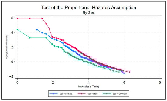 The main assumptions of the Cox model are proportional hazards, meaning the hazard ratio between any two groups is constant over time, and log-linearity, which assumes a linear relationship between continuous covariates and the log of the hazard rate. The standard tests of the PH assumption are based on examination of the Schoenfeld residuals; thus, a numerical test of the PH assumption is used to finish off the estimation section, with a numerical estimate based on the Schoenfeld residuals [20]. The scaled Schoenfeld residuals [21] are centered at and, when there is no violation of PH, should have a slope of zero when plotted against functions of time. The stphplot command (available in Stata) uses log–log plots to test proportionality. If the lines in these plots are parallel, then we have further indication that the predictors do not violate the proportionality assumption.