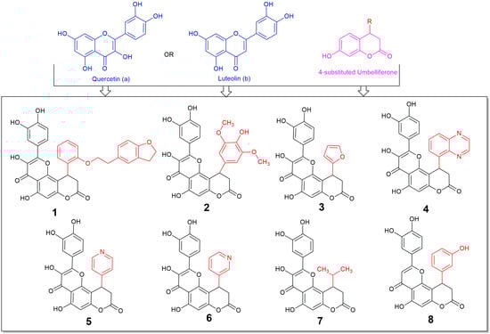 Structures of the synthesized compounds 1–8, derivatives of (a) quercetin (compounds 1–7) or (b) luteolin (compound 8), and 4-substituted 7-hydroxycoumarin (umbelliferone).