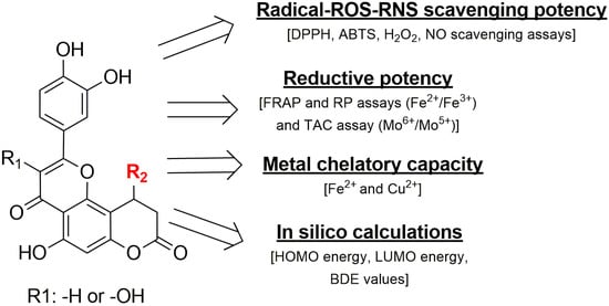 Based on the considerations described above, we present the design, synthesis, and biological evaluation of a series of polycyclic compounds combining flavonoids (quercetin or luteolin) and 7-hydroxycoumarin (umbelliferone) (Figure 1). This design was guided by efforts for the fusion of flavonoids and coumarins scaffolds as part of the multi-targeting strategy, aiming at minimizing polypharmacology related interactions and pharmacokinetic drawbacks that may derive from the increased polarity of the flavonoids and the poor solubility of the flavonoids and umbelliferone [21,22,23]. The antioxidant activity of the synthesized compounds was assessed using synthetic stable radicals including 2,2-diphenyl-1-picrylhydrazyl (DPPH) and ABTS (2,2′-azinobis-(3-ethylbenzothiazoline-6-sulfonic acid), as well as evaluating their NO and hydrogen peroxide scavenging abilities. Additionally, their reducing capacity toward ferric and molybdenum VI ions, as well as their ferrous and bivalent copper chelating potential was determined. Furthermore, in silico evaluation of their molecular behavior and antioxidant capacity, in order to bridge the results of the in vitro assays, was performed.