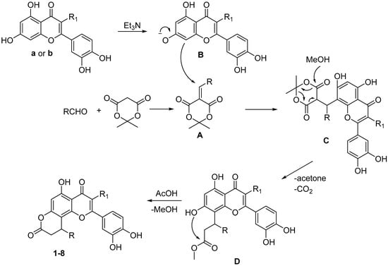 Polycyclic compounds 1–8 were prepared from flavones quercetin (a) or luteolin (b) by the two step reaction presented below (Scheme 1). In the considered case the formed methyl esters intermediates, without isolation, were cyclized into the final products 1–8. The conclusive heterocyclization was performed at reflux in acetic acid leading to dihydropyranone final compounds in 51–68% yields.
