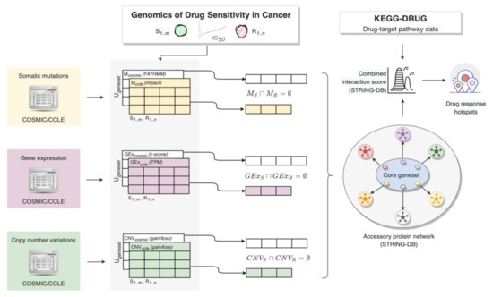 The COSMIC single-point variants and short insertions/deletions at gene level that consistently identified in all m or in all n subgroups of MS or MR matrices, respectively, and those that are mutually exclusive between S and R models are considered of potential significance for drug response. An estimation of the damaging alleles burden is assigned to each mutation, as a measure of its functional impact, using the FATHMM-MKL algorithm [21]. Genes with mutually exclusive alterations in MS and MR with at least one polymorphic site of FATHMM-MKL score > 0.5 are considered pathogenic. For less stringent analyses, the FATHMM criterion may be ignored in the subsequent drug–gene associations. The impact of the CCLE mutations (DepMap, Public 21Q3) [22] is assessed based on the categorical values assigned to each polymorphic site, i.e., the damaging (nonsense, frameshift, splice site, de novo out-of-frame start and SNP/insertion/deletions at start codon), non-conserving (missense, in-frame deletions/insertions), and silent mutations. As for the COSMIC data, the genes with mutually exclusive alterations that have at least one damaging mutation in all S or R models are considered potential gene markers with functional relevance to drug response.