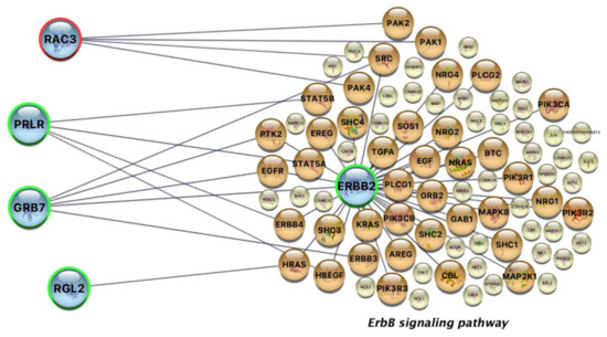 Another crucial issue is that the small GTPase RAC3 gene, found to be mutated in all resistant to afatinib breast cancer cell lines, has been previously shown to control invasion and metastasis in breast cancer, by controlling adhesion and matrix degradation [32]. Moreover, the observation that in all sensitive to afatinib breast cancer cell lines, the prolactin receptor (PRLR) gene has been found to be overexpressed, further validates the obtained findings, since recent evidence supports that the PRLR and EGFR/HER2 signaling crosstalk play a crucial role in the development of mammary glands and breast carcinogenesis, whereas their combined actions may be responsible for endocrine resistance in breast cancer patients resulting in tumor relapse [33]. Similarly, the analysis of TCGA molecular data revealed that the EGFR family MAP kinase adaptor GRB7 gene is co-amplified with ERBB2/HER2 in five different tumor types e.g., GRB7 was amplified in 10 and 20 copies in lung adenocarcinoma and breast cancer, respectively [34]. Furthermore, regarding the third gene Ral Guanine Nucleotide Dissociation Stimulator Like 2 (RGL2) gene that is found to be overexpressed in all the sensitive to afatinib breast cancer cell lines, it has been recently shown that RGL2 modulates β-catenin and KRAS, by promoting colorectal cancer cells metastasis [35]. Among all pharmacogenes targets, SRC is the only gene in the ERBB signaling pathway whose protein product strongly interacts with proteins coded by both resistant and sensitive gene markers (Figure 2). Specifically, the SRC protein is in strong interaction with the protein coded by RAC3, which was found mutated in all resistant cell lines in a mutually exclusive manner, and the proteins coded by ERBB2 and GRB7, which are mutually exclusively over-expressed in all sensitive cell lines. SRC could therefore to play a mediating role in afatinib’s response through a different course of action. Up to now, there has been significant evidence suggesting that SRC is a mediator of resistance to afatinib and other HER-family member inhibitors [36,37,38,39].
