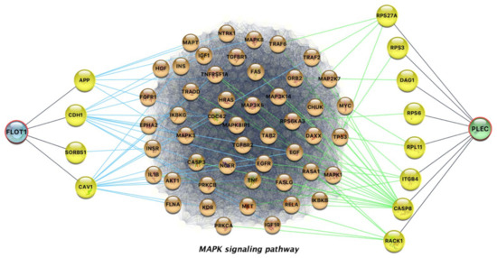 Network representation of the indirect interactions of FLOT1 and PLEC with proteins involved in the MAPK signaling pathway. Overexpressed FLOT1 and mutant PLEC are found in all resistant glioblastoma multiforme cell lines, contrary to sensitive cell lines.