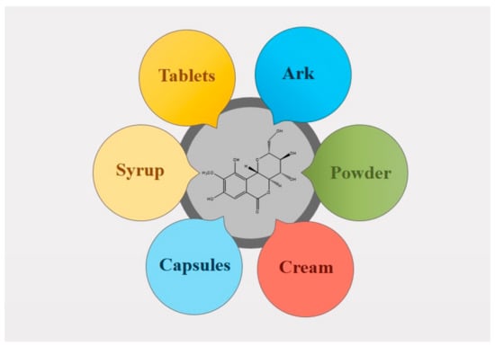 BER possess low aqueous solubility, which results in its poor oral bioavailability. Its poor permeability and low solubility are the major obstacles in its formulation development. Commercially, it is available as soft gelatin capsules, tablets, and pills (Table 2 and Figure 2). Liquid dosage forms for BER are not available on the market, owing to its poor aqueous solubility. The solubility of BER was reported to be highest in polyethylene glycol-400 (PEG-400), followed by dimethyl sulfoxide (DMSO), diethylene glycol monoethyl ether, propylene glycol (PG), ethylene glycol (EG), ethanol, isopropanol (IPA), ethyl acetate (EA), 2-butanol, 1-butanol, and water in a range of temperatures (298.15 to 318.15 K) and pressures 0.1 MPa []. Generally, the low water uptake of BER suggested good stability in the presence of moisture during formulation and storage [].