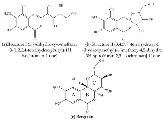 - Bajracharya, G.B. Diversity, Pharmacology and Synthesis of Bergenin and Its Derivatives: Potential Materials for Therapeutic Usages. Fitoterapia 2015, 101, 133–152. [Google Scholar] [CrossRef]