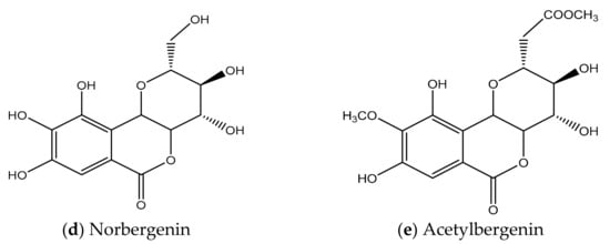 - Hay, J.E.; Haynes, L.J. 453. Bergenin, a C-Glycopyranosyl Derivative of 4-O-Methylgallic Acid. J. Chem. Soc. Resumed 1958, 2231–2238. [Google Scholar] [CrossRef]