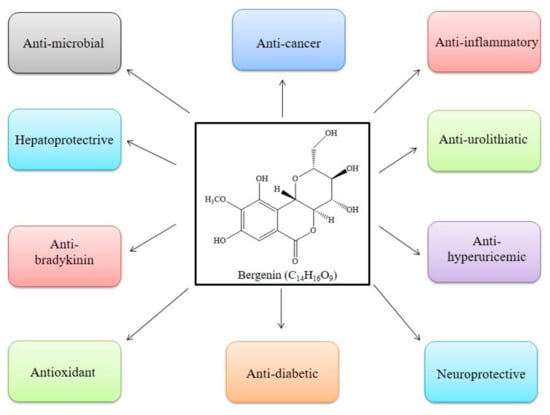 Various applications of bergenin are elaborated previously in Table 1.