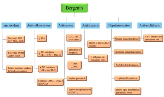 Bergenin (and its congeners) are extensively employed in Ayurvedic, Traditional Chinese Medicine, Unani, and various folk systems of medicine [,]. This bioactive has gained noteworthy attention and is a medicine of choice, by virtue of its multi-target approaches. BER is known for its multiple pharmacological features; anti-inflammatory, anti-oxidative, anti-arthritic, and anti-cancer activities [], as in Table 1 and Figure 4. In addition, some of the patents related to BER activities are listed in Table 3. The effectiveness of this phytochemical participates in several mechanisms, such as lipid peroxidation inhibitory activity, free radical scavenging activity [], initiating apoptosis and cell cycle arrest in the G0/G1 phase, inhibiting the phosphorylation of STAT3 proteins, inducing the formation of TNF-α, NO, IFN-γ, IL-17, IL-12, and inhibiting the α-glucosidase enzyme (Table 1, Figure 5). All of these have been explained in detail in the sections below [].