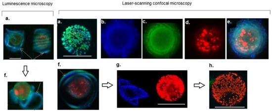 Images of vegetative microspores from Equisetum sativum under luminescence (excitation 360–380 nm) and laser-scanning confocal microscopes (laser 405 nm). Bars = 30 µm. Images for both microscopes: (a)—dry spores, (f)—first study of development. Other letters-developing spore for images in laser-scanning confocal microscope: (b–d)—the fluorescence in blue, green and red channels, (e,f)—summa of images in confocal microscope, (g)—missing blue-fluorescent envelope and elaters. Liberated cells with red-emitted chloroplasts (g,h) is ready to form multicellular structures.