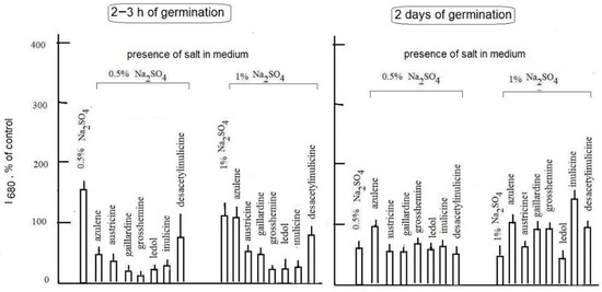 Figure 3 shows the changes in the germination of unicellular horsetail spores in the first two hours or two days after wetting with a nutrient medium. In variants with the presence of 2 mg/mL of studied sesquiterpene lactones in two hours of germination on the medium containing 0.5 or 1% sodium sulfate salt, a decrease in the formation of chlorophyll (test for the germination of spores) was noted compared to growth on a medium without sodium salt (taken as 100%).