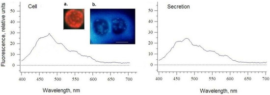 The image of cells with secreted mucilage containing histamine under a luminescent microscope and recorded with microspectrofluorimeter the fluorescence spectra of horsetail cells and mucilage secreted by them during salt stress. Excitation with light 360–380 nm. (a) Spore after 24 h of development before and (b) after histochemical staining.