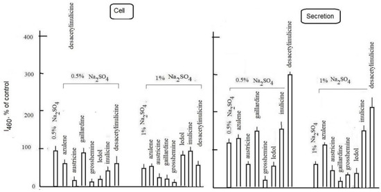 Figure 7 shows the concentration dependence of their action on the content of histamine both in the cell and in the secretion with a maximum (1%) amount of sodium sulfate as a stress factor. The effects are more stable in the grosshemine variant both inside and outside the cell. Grosshemine reduces the amount of biogenic amine both in cell and in secretion. In the azulene, austricine, and ledol variants, the reaction with the presence of sodium sulfate reduced histamine mainly in the mucilage of secretion at some concentrations of these compounds.