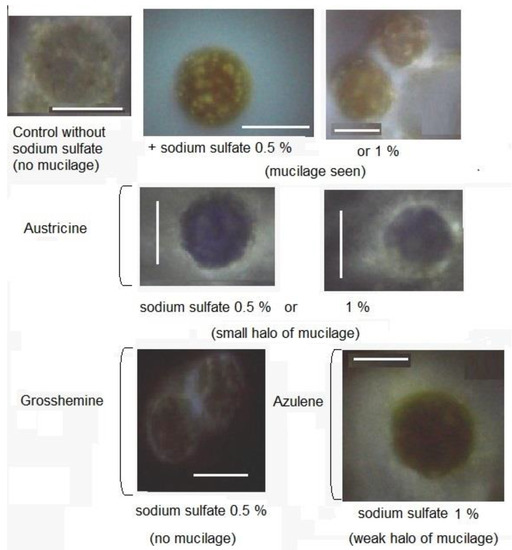 Figure 6 shows how cell fluorescence looks in the presence of sesquiterpene lactones. An extensive field of mucilage around the microspore is noted in the presence of sodium sulfate in the medium. The addition of the most active lactones such as austricine or azulene, significantly reduced the fluorescent halo around the cell and the intensity of fluorescence related to histamine presented in the medium with sodium sulfate. The addition of the most active lactones, austricine, or azulene, significantly reduces the fluorescent halo around the cell and the intensity of this fluorescence related to histamine.