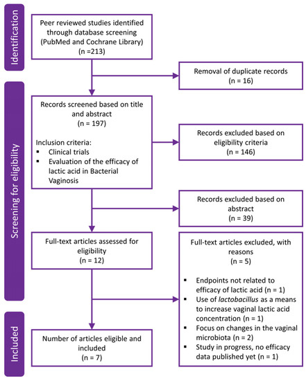 In total, 213 results were retrieved from the literature search, of which 51 abstracts fulfilled the predefined inclusion criteria and were further evaluated. Based on the abstracts, 12 full text articles were then reviewed for eligibility, of which 7 fulfilled the predefined criteria to assess the efficacy of lactic acid in the prophylaxis and treatment of BV. Figure 1 depicts a PRISMA flow diagram describing the literature search and article selection process. The main reasons for article exclusion after fulfillment of the inclusion criteria were endpoints not being related to efficacy of lactic acid [64], involvement of treatment with Lactobacillus spp. as a means to increase vaginal lactic acid concentration [65], or focus on changes in the vaginal microbiota [66,67], which are beyond the scope of the current review. One study would have qualified to be included in this assessment but was still in progress with no efficacy results published at the time the literature search was performed [29].