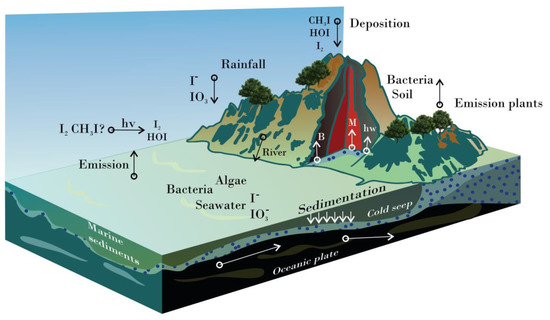 In the Earth’s crust, the richest inorganic source of iodine is oceanic sediments (68.2%) and continental sedimentary rocks (27.7%), followed by igneous and metamorphic rocks (2.7%), seawater (0.81%), and mafic oceanic crust (0.68%) [9]. In the atmosphere, sea spray aerosolization, volcanic gases, and human activities contribute to iodine emissions, but the highest discharge is given by biological conversion to volatile methyl forms, such as methyl iodide (CH3I).