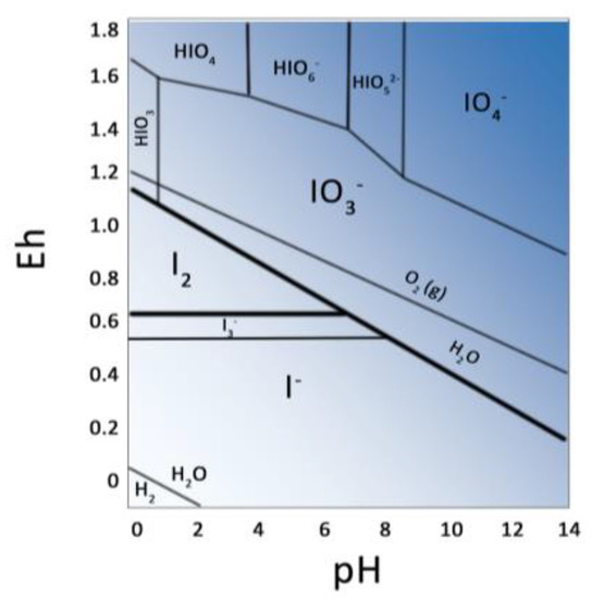Iodine speciation in aqueous systems. Pourbaix diagram of iodine depicting species stability by pH and Eh [26]. Abbreviations: pH, potential of hydrogen; Eh, redox potential (measured in volts).