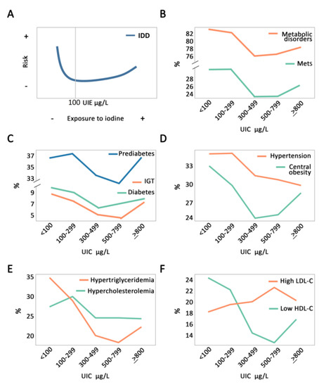 Association of diseases and iodine intake. (A) Exposure to iodine and the risk of developing IDD ([67] data from [79], Academic Press, 2009). Relationship between UIC (µg/L) and the prevalence (%) of (B) metabolic disorders and MetS, (C) prediabetes, diabetes, and IGT, (D) hypertension and central obesity, (E) hypertriglyceridemia and hypercholesterolemia, and (F) HDL-C and LDL-C (data from [70], Mary Ann Liebert, Inc., publishers). Abbreviations: HDL-C, high-density lipoprotein cholesterol; IGT, impaired glucose tolerance; IDD, iodine deficiency disorders; LDL-C, low-density lipoprotein cholesterol; MetS, metabolic syndrome; UIE, urinary iodine excretion; UIC, urinary iodine concentration.