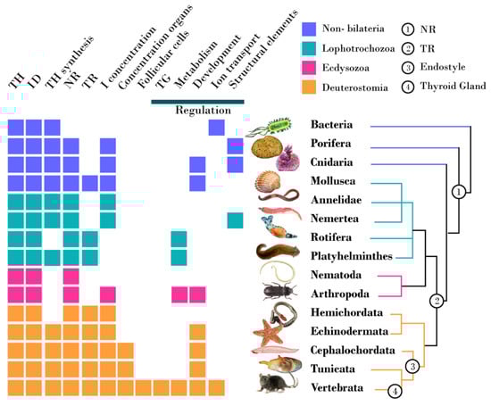 Interestingly, many organisms along the three of life produce one or more components of the thyroid system (Figure 4). Nuclear receptors (NRs) are found in all animals and can bind to several hormones (including THs); hence, they are considered ancestors of TRs [126]. TRs can be found in vertebrates and lineages of nonvertebrate deuterostomes [127]. Numerous nonbilaterians can accumulate iodine into specific cells and tissues [125]. However, only chordates have specialized iodine-concentrating organs, the endostyle in cephalochordates and the thyroid gland in vertebrates [126]. Insects, plants, protozoa, and bacteria produce THs (including analogs or derivatives) and deiodinase enzymes [125], even though the incidence of THs might have no hormonal implications outside of chordates. For instance, moon jellyfish Aurelia aurita synthesizes MIT, DIT, and T4 in significant amounts. Nevertheless, the transition from polyp into jellyfish (strobilation) can be induced by temperature and the addition of I−, but is not dependent on THs [128]. Moreover, in land plants, it is suggested that THs, more than hormones, could act as protective agents by altering the metabolisms of herbivores or plagues [129].