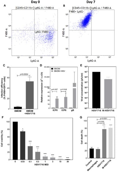 Figure 1. Characterisation of M-HSV1716. Isolation of BMDM at day 0 was characterised as predominantly undifferentiated monocytes (A), x-axis—Ly6G (neutrophil marker), y-axis—F480 (macrophage marker). Following 7 days of incubation, these differentiated into F4/80-expressing macrophages (B). The infection efficiency of BMDM with HSV1716 (MOI 5) was quantified by flow cytometry of dual-stained F4/80 macrophage marker with GFP-expressing HSV1716 (C). Low-level non-specific binding of antibody was noted in untreated cells. (D) HSV1716 patency within BMDMs was assessed by measuring viral replication genes 24 h post infection. M-HSV1716 was prepared by incubating BMDM with HSV1716 at MOI 25 for 2 h. Cells were harvested and washed in PBS prior to administration, and plaque assays were performed to ascertain viral titre of treatment groups (E). (F) HSV1716 was used to infect PyMT-TS1 cells at a concentration range of MOI 0.03–30, and the effects on cell viability were determined by Alamar blue assay 7 days post infection. (G) FACS data showing equivalence in cell death (TOPRO-3) when spheroids were infected with HSV1716 and M-HSV1716. Data represents the mean ± SEM of assays performed in triplicate. Statistical significance was analysed by unpaired t-test (C,D). * = p < 0.05, **** = p < 0.0001 one-way ANOVA (F,G).