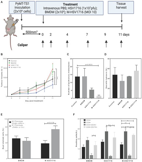 Figure 2. M-HSV1716 reduces tumour burden in a primary mouse model. PyMT-TS1 cells were implanted into the 4th mammary fat pads to assess the effectiveness of HSV1716 or M-HSV1716 in primary tumours (A). Tumour growth was measured by digital calipers for 11 days following treatment (B). Pulmonary metastases (C) and necrosis (D) were quantified histologically postmortem from an average of 2–4 different sections of lung tissue over 100 μm apart from 2–4 slides. Immune cell changes within the TME were seen when M-HS1716 was given compared to macrophage alone. Flow cytometric analysis of dispersed tumours showed a skewing to M1 macrophage phenotype (E) and an increase in CD8+ T cells (F). Data are mean ± SEM, n = 6–8 mice per group. * = p < 0.05, ** = p < 0.01, *** = p < 0.001 analysed using one-way ANOVA. Panel A was created with BioRender.com, accessed on 6 October 2022.