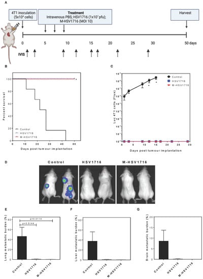 Figure 3. M-HSV1716 is equivalent to intravenous HSV in an early metastatic model. Luciferase-labeled 4T1 cells were injected into the left ventricle of the heart via intracardiac injection of female Balb/C mice. At days 5, 7 and 9, mice were treated with PBS, HSV1716 (1 × 107 pfu/mL) or M-HSV1716 ((1 × 106 macrophages infected at MOI 10), and the development of metastases was monitored by IVIS up to day 50 (A). M-HSV1716 provided a survival advantage (B, Log-Rank test) corresponding with an absence of visible metastatic disease quantified by flux analysis of luciferase-expressing 4T1 cells (C,D). The burden of metastases was calculated as the percentage of the organ with metastatic involvement calculated as an average of 2–4 different sections of lung (E), liver (F) and brain (G), over 100 μm apart from 2–4 slides. Data shown are mean ± SEM, n = 4–6 animals. Panel A was created with BioRender.com, accessed on 6 October 2022.
