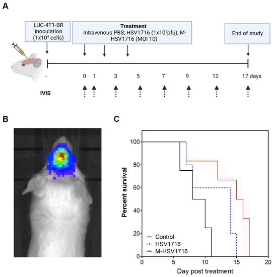 Figure 4. M-HSV1716 improves survival of mice with stereotactically implanted brain metastases. A brain metastases model was formed by the inoculation of 1 × 104 LUC-4T1-BR cells intracranially, to a depth of 3 mm, using a Hamilton syringe. Animals were imaged until the intracranial lesion was visible and then treated with either PBS, HSV1716 or macrophage-HSV1716 (A). (B) A representative image of a brain metastases as seen on IVIS. (C) A Kaplan–Meier curve demonstrated a survival advantage with M-HSV1716 compared to other treatment groups (Log-Rank test). Mice were culled when tumours reached the maximum permitted size as determined by the IVIS, at which point tissues were harvested. Only mice treated with M-HSV1716 survived beyond day 15. Data shown are mean ± SEM, n = 5 animals. Panel A was created with BioRender.com, accessed on 6 October 2022.