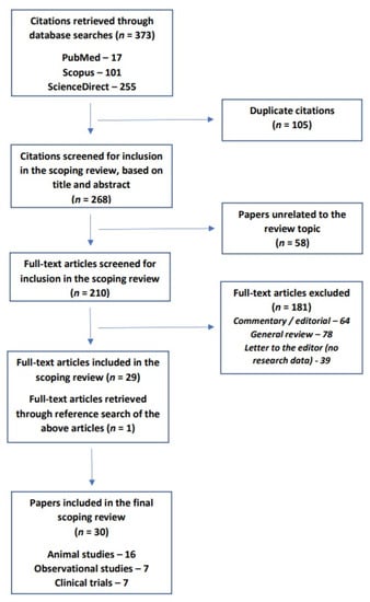 Of the 268 citations screened for inclusion, 58 citations were excluded because they were unrelated to the topic of the review. These included animal or human studies of selenium or selenium-containing compounds in other types of diseases, such as dermatological or endocrine disorders, with no measurement of anxiety-related outcomes. The full text of the remaining 210 articles was examined. Among these, 181 citations were excluded because they represented other publication types, such as general reviews, commentaries, or letters to the editor, that contained no original research or evidence. By searching the references of the remaining twenty-nine papers, one further paper was identified for inclusion. In all, a total of 30 studies were included in this review [43,44,45,46,47,48,49,50,51,52,53,54,55,56,57,58,59,60,61,62,63,64,65,66,67,68,69,70,71,72].