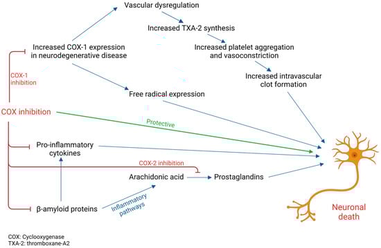 On the whole, dementia is associated with a greater burden of cardiovascular risk factors, including diabetes mellitus, smoking, hypertension, and metabolic syndrome [5]. As such, there is a significant vascular contribution to dementia, with the presence of vascular dysregulation doubling the chance that the neurodegenerative pathology will evolve into dementia [6]. Indeed, all major dementias involve some degree of vascular dysregulation, ranging from 61% in frontotemporal dementia to 80% in Alzheimer’s disease (AD) [6]. As such, aspirin may play a role in targeting this vascular dysregulation. Aspirin is one of the most commonly used drugs for primary and secondary prevention of cardiovascular disease [7]. It is a non-competitive, irreversible inhibitor of cyclooxygenase (COX)-1, -2, and -3. At low doses of 75–300 mg/day, its primary effects are in COX-1 inhibition and subsequent thromboxane A2 synthesis [8]. This reduces platelet aggregation and vasoconstriction, resulting in reduced intravascular clot formation. Neurodegenerative diseases have also been found to have increased expression of COX-1 [9,10], and studies have shown that it is a central part of the neuroinflammatory response [11]. As such, studies have shown that COX-1 inhibition reduces neuroinflammation mediated by β-amyloid proteins and also reduces pro-inflammatory cytokine release (Figure 1) [12,13]. Animal studies on COX-1 inhibition also show its potential role in preventing working memory deficits [14]. The selective COX-1 inhibitor triflusal was shown in a randomised controlled trial to reduce the progression of MCI to dementia [15].