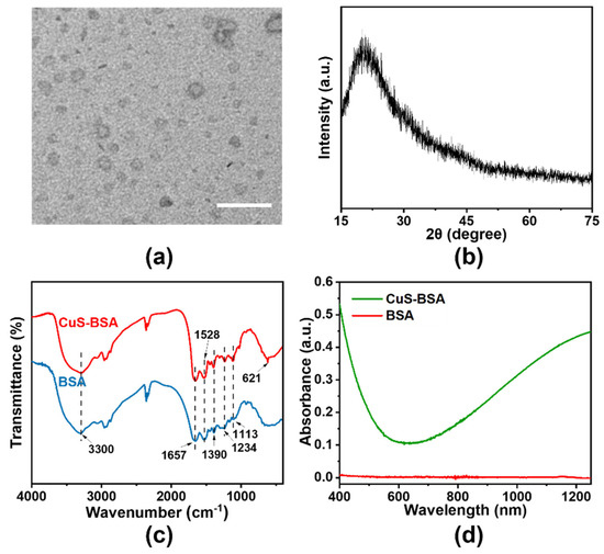 Characterizations of CuS–BSA. (a) TEM image of CuS–BSA. Scale bar: 50 nm. (b) XRD pattern of CuS–BSA. (c) FT–IR spectroscopy of CuS–BSA and BSA. (d) UV–Vis–NIR absorbance spectra of CuS–BSA and BSA.