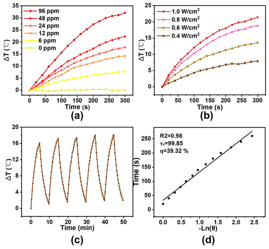 The photothermal performance of CuS–BSA was systematically evaluated in the presence of NIR laser. As presented in Figure 2a, the temperature of the CuS–BSA solution after NIR irradiation kept increasing along with the irradiation time, and the final temperature was positively dependent on the concentration of CuS–BSA. When the Cu concentration in CuS–BSA was 24 ppm, the temperature increased by 17.8 °C upon NIR laser irradiation for 5 min, which was enough for LT–PTT whose temperature was maintained at 45 °C [35]. The photothermal effect of CuS–BSA was also positively correlated with the power density of NIR laser as shown in Figure 2b. When the power density of NIR laser increased from 0.4 to 1.0 W/cm2, the temperature increased from 7.9 to 21.4 °C. These results showed that CuS–BSA could efficiently convert laser energy into heat via light absorption at 808 nm [36]. As shown in Figure 2c, there was no significant difference in temperature elevation over five irradiation cycles, suggesting that the CuS–BSA possessed excellent photothermal stability. Finally, we measured the photothermal conversion efficiency (η) of CuS–BSA according to the previously reported method. As presented in Figure 2d, the value of η was 39.32%, which demonstrated high ability to transform NIR light into heat and could serve as a potential photothermal agent [37].