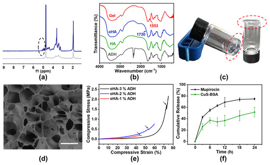 Characterizations of oHA and Gel. (a) 1H–NMR spectra of oHA and HA. (b) FT–IR spectroscopy of Gel, oHA, ADH, and HA. (c) Optical image and (d) SEM image of Gel after complete gelation. Scale bar: 100 μm. (e) Mechanical properties of Gel with different ADH concentrations (1%, 2%, 3%). (f) Release behaviors of M@Gel with mupirocin concentration of 1.0 mg/mL and C@Gel with Cu concentration of 24 ppm.
