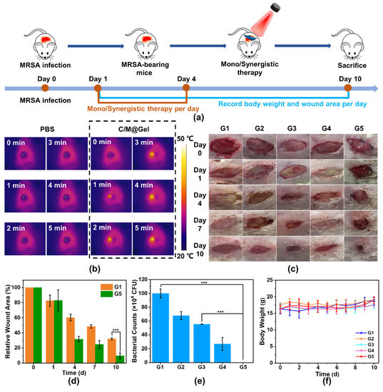 Healthy mice were randomly divided into five groups and received different treatments: including G1: PBS, G2: Gel, G3: C@Gel with NIR, G4: M@Gel, G5: C/M@Gel with NIR. The treatment procedure was illustrated in Figure 5a. MRSA–infected focal wounds were established in the mice model by adding 20 μL of bacterial suspension (1 × 107 CFU/mL) to the defected dorsal skin and incubating for 24 h. At the first four days, each group received different treatments per day. To evaluate the antibacterial effect of C/M@Gel with NIR irradiation for wound infection, the body fluid around the infected wound was extracted and analyzed by standard plate counting at the end of four days of different treatments. The temperature of the infected wound was examined and exhibited by thermographic images. As seen in Figure 5b, the site of infected wound yielded an elevated temperature maintained at about 45 °C in C/M@Gel with NIR group, while the elevated temperature in PBS group was negligible. As shown in Figure 5c and Figure S10, in the PBS group, the wounds healed slowly due to self–healing ability, but there were still obvious pus and large numbers of bacteria remaining in the wound, which may aggravate the infection. Accelerated wound healing and fewer bacteria could be observed in C@Gel with NIR and M@Gel groups, which was attributed to certain antibacterial effects of CuS–BSA and mupirocin. Remarkably, minimal wound area and complete ablation of bacteria colonies were presented in the C/M@Gel with NIR group, demonstrating that the synergistic platform combining LT–PTT and antibiotic therapy had excellent antibacterial efficacy [14] (Figure 5d,e). These results demonstrated that the established synergistic antibacterial platform C/M@Gel with NIR irradiation possessed an ideal antibacterial effect and could effectively inhibit bacterial survival, and further accelerate wound healing. Meanwhile, the body weight of mice remained stable along the treatment process, which demonstrated bare side effects and good compatibility of C/M@Gel (Figure 5f).