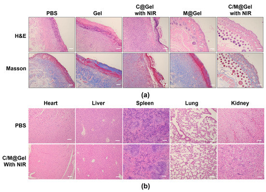The healing states of treated wounds were assessed by H&E staining and Masson staining. In Figure 6a, H&E staining disclosed that there were obvious signs of tissue infections and skin ulcers in the PBS groups, including many macrophages and neutrophils infiltrating in the tissues. By contrast, the wound was almost completely healed, and the wound tissue was mainly composed of fibrous cells arranging in order in the C/M@Gel with NIR group. Masson staining showed that there was structural disorder of muscle fibers and collagen fibers in PBS group, but there was no obvious destroy in C/M@Gel with NIR group. Meanwhile, as shown in Figure 6b, there was no obvious abnormality in the sections of main visceral tissues (heart, liver, spleen, lung, and kidney) for C/M@Gel with NIR group, indicating that the side effects of this synergistic antibacterial system were negligible in mice.