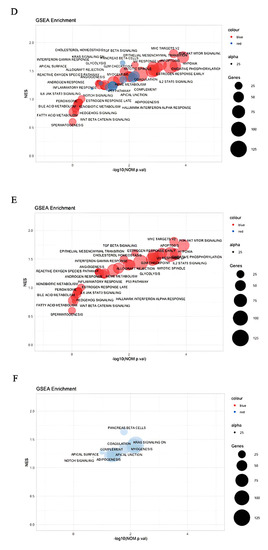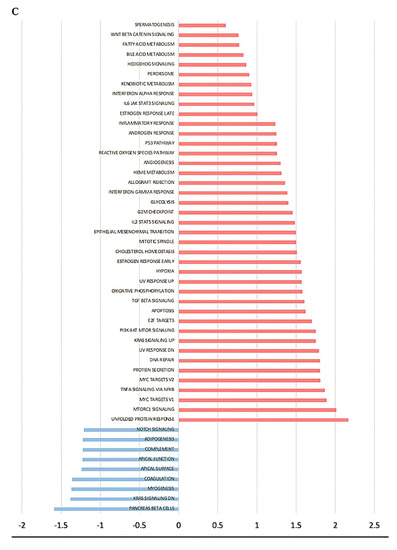 - Subramanian, A.; Tamayo, P.; Mootha, V.K.; Mukherjee, S.; Ebert, B.L.; Gillette, M.A.; Paulovich, A.; Pomeroy, S.L.; Golub, T.R.; Lander, E.S.; et al. Gene set enrichment analysis: A knowledge-based approach for interpreting genome-wide expression profiles. Proc. Natl. Acad. Sci. USA 2005, 102, 15545–15550. [Google Scholar] [CrossRef] [PubMed]
