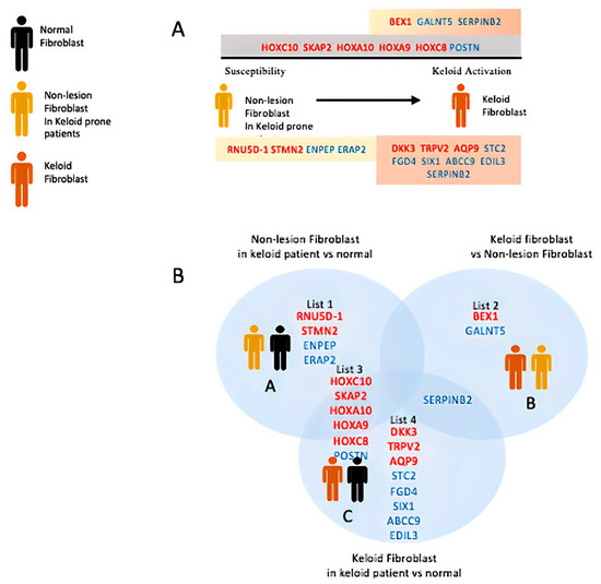 DEG of keloid, susceptible, and control. (A) The first row depicts exclusive gene expression of keloid/susceptible (list2); second gray row depicts the common underlying difference between keloid/susceptible with control (list3); and the bottom row (list1, 4) depicts the exclusive distinction of keloid/susceptible with control. (B) Venn diagram illustrating the above relationships.