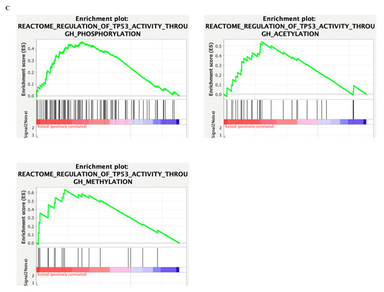 Nevertheless, the enrichment to TGF-β-signaling is dampened. It may suggest that their interaction is equally potent in deciding cell fate despite their interaction enrichment not reaching the significance threshold. In contrast, such findings may also indicate that their primary interaction is not mediated on the proteomic level but by other epigenetic and genomic methods and require different methodologies, such as ATAC-seq or CHIP-seq. Their associations may lie in the epigenetic framework and not in the genomic or proteomic study. Regardless, we investigated whether the TP53 activation may modulate epigenetic reprogramming by performing GSEA enrichment of TP53 epigenetic modulations in Figure 4B and showed that during keloid pathogenesis, TP53 modulated numerous epigenetic changes that may dictate subsequent phenotype change. A finding that is unsatisfactory to explain but hints that TP53 may modulate the permanent senescence epigenetic markers that resemble that of cancer.