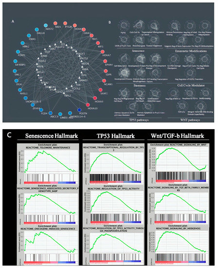 Collapsed clustering of GO-hallmark landscape. (A,B) Enriched interactions with TGF-β- signaling (yellow) and TP53, senescence (green); (C) GSEA enrichment of TP53 epigenetic modulations.