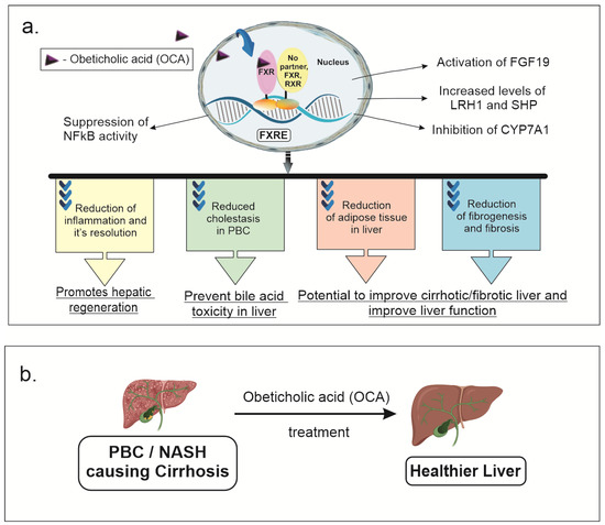 In recent years, the FXR group of bile acid receptors is currently under investigation for its potential role in the treatment of primary biliary colangitis (PBC), non-alcoholic steatohepatitis (NASH), non-alcoholic fatty liver disease (NAFLD), and primary sclerosing cholangitis (PSC) [51,52,53,54,55,56,57,58,59,60,61,62,63,64,65,66,67,68,69,70,71]. In 2016, the Food and Drug Administration approved OCA for treating PBC refractory to ursodeoxycholic acid (UDCA) [45]. Besides OCA, several other FXR agonists are under investigation for the treatment of PBC and NASH [72,73,74,75]. Recent clinical studies suggest OCA may work synergistically with lipid modifying medications to further improve long-term outcomes with primary sclerosing cholangitis. Specifically, OCA improves morbidity and mortality in NASH patients with their different histological, metabolic, and biochemical issues in PBC, PSC, or liver patients. In this review, we examine the pharmacology of OCA towards the treatment of PBC, PSC, NASH, and NAFLD. In addition, we examine future directions and applications of OCA for PBC, PSC, NASH, and NAFLD.