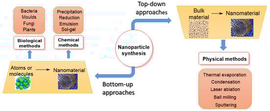 The properties and therapeutic applications of NPs or PDMNPs depend on their synthesis method. They are often synthesized using the top-down approach and the bottom-up approach [34,35]. As shown in Figure 2, to make nanoparticles, both approaches include physical, chemical, and biological processes [36]. The bulk material under study is broken down into fine particles using suitable techniques such as mechanical grinding, thermal evaporation, sputtering, and ball-milling in the top-down approach, whereas in the bottom-up approach, nanomaterials are synthesized by assembling atoms or molecules into new or novel material in the nano-size using chemical and biological methods [37]. Condensation and evaporation are two important physical processes that generate metal NPs in a furnace tube at atmospheric pressure. These processes mostly follow the top-down method, utilizing electrical or mechanical energy to grind materials into minute NPs. Even though physical techniques do not involve hazardous materials, they nonetheless cost more to produce nanoparticles since they need expensive and energy-intensive equipment [38]. Chemical methods include the reduction, precipitation, hydrothermal, sol-gel, emulsion, and micro-emulsion processes. The most widely used technology among them is sol-gel because of its flexible implementation and high yield. Chemical processes are faster at producing bulk materials, but they also require expensive, hazardous substances that are detrimental to the environment and our health [39]. The synthesis of NPs using salts or oxides of metals such as Ag, Au, Pt, and Pd has attracted a lot of attention in recent decades due to the need to create materials that are safe for the environment, society, and economy, as well as for use in everyday items like electrical appliances, vehicles, aircraft, biomedical devices, and medications [40]. Because they are uniform in size, shape, composition, surface charge, and optical properties, metal-based NPs have many advantageous medical and industrial applications. However, the high cost and purity of metals during synthesis is a major concern in the biomedical and pharmaceutical sectors [41,42]. Greener approaches to synthesizing biogenic NPs are constantly in demand by researchers to reduce toxic effects and maintain a green environment because of their biocompatible, clean, cost-effective, and eco-friendly properties [43,44].